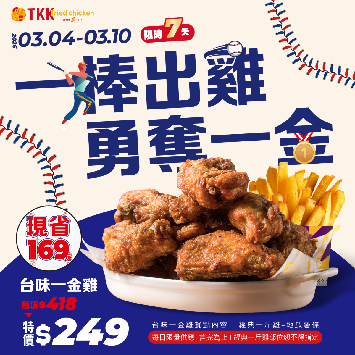 身為台灣本土速食的驕傲,頂呱呱當然要用最道地的「台味」來相挺中華隊!這次誠意滿滿地祭出招牌的「台味一金雞(一斤雞)」超殺優惠,巧妙利用諧音祝中華隊順利「奪金」,主打滿滿一台斤600g超巨份量炸雞,一斤雞嚴選生鮮雞肉,透過獨門醃製工法入味,外皮金黃酥脆、肉質鮮嫩多汁;同時更加碼推出【辣味雞翅2入優惠】特價99元(原價118),用獨門香料醃製入味,辣而不嗆的吮指滋味超級解饞,絕對是緊盯賽況時的絕佳神隊友。一口酥脆的台式炸雞配上一口冰涼飲料,用最熟悉的家鄉味為台灣英雄們集氣,這才是專屬我們台灣人的浪漫應援!