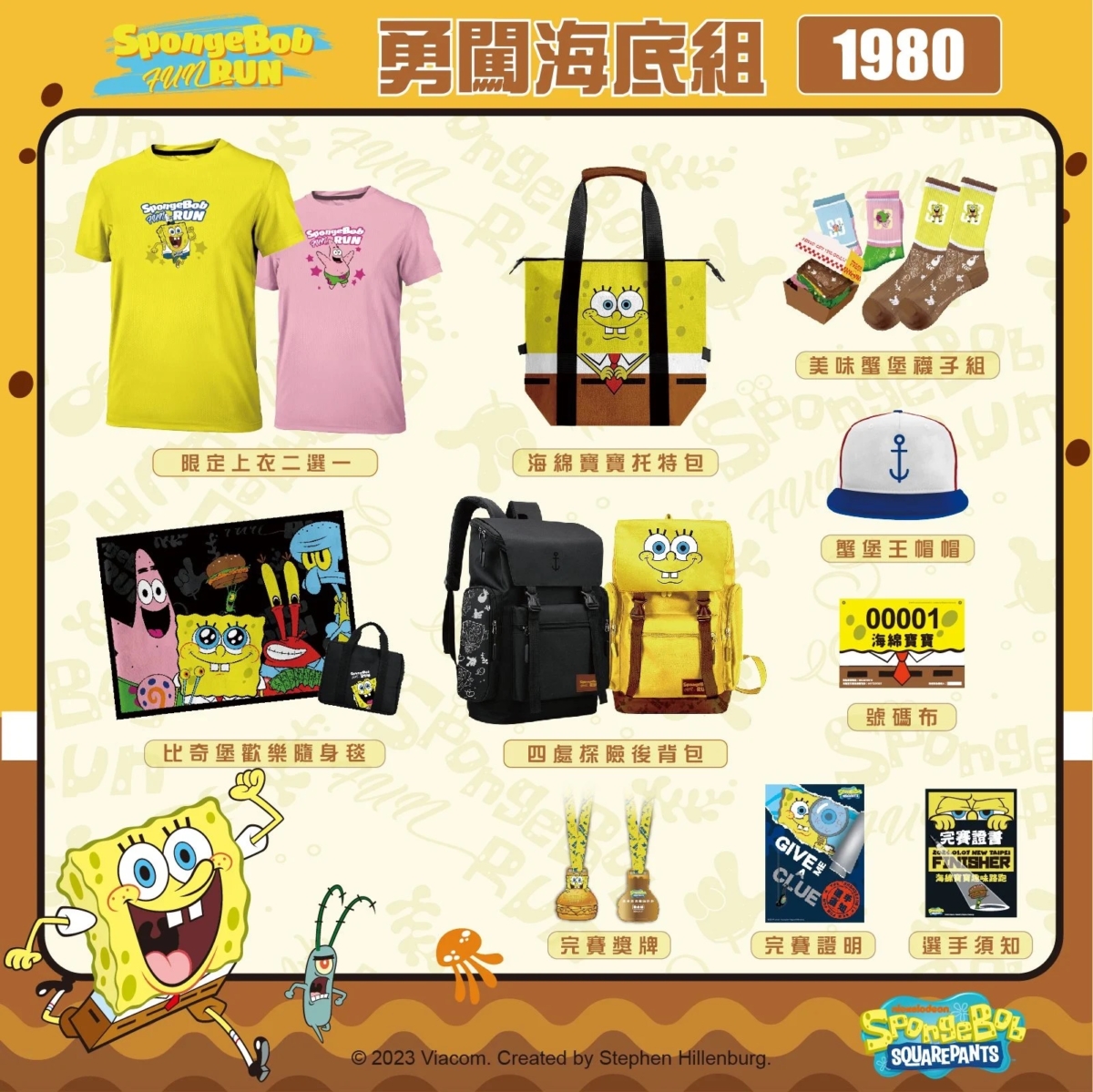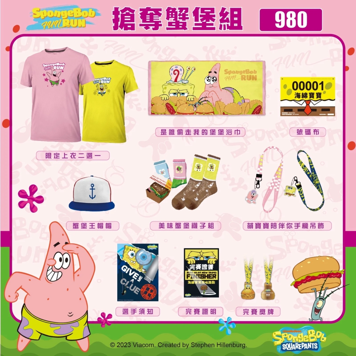 完成這一組的朋友們,能獲得的內容物包含上衣、帽子、襪子組、浴巾、手機掛繩與完賽證明,這些周邊上面都印有海綿寶寶、派大星、章魚哥等角色們的可愛圖樣,完全可以笑著跑完全程~