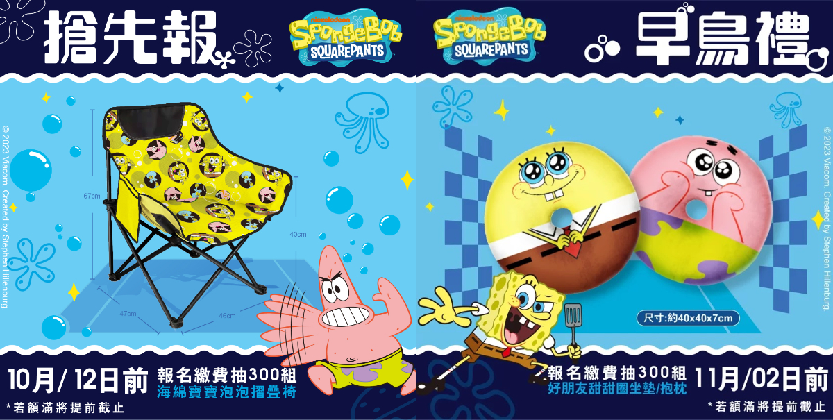 粉絲們只要在10/12前完成報名,還有機會獲得「泡泡折疊椅」;而11/2前完成報名,還可再抽早鳥禮「好朋友甜甜圈坐墊」,有可愛到不行的海綿寶寶與派大星兩款,兩款皆限定300位幸運粉絲!所以趕緊把握時間啦~