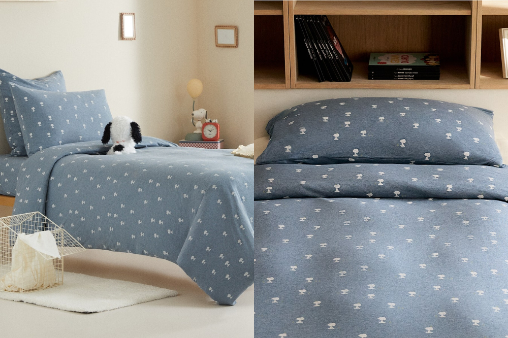 寢具必備的床包組,編輯特別介紹以下兩款,一款為丹寧色系的滿版史努比,另一款則是集結各角色的活潑組合,其中枕套還有一隻不知所措的史努比,真的是會讓人笑著入睡呀~