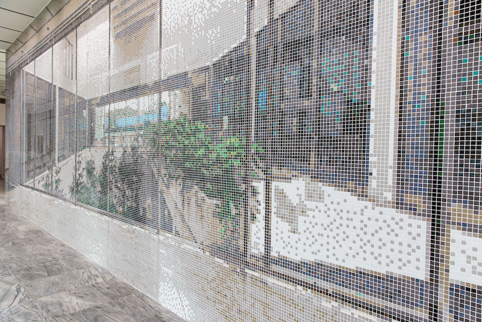 北京藝術家王衛以一道雙面馬賽克磁磚所構築的高牆揭開展覽序幕,將美術館入口迴廊空間分隔為二,運用鏡像手法讓作品與兩面落地窗相互對應,改變空間配置和觀看角度,挑戰了觀者對處所的體認。