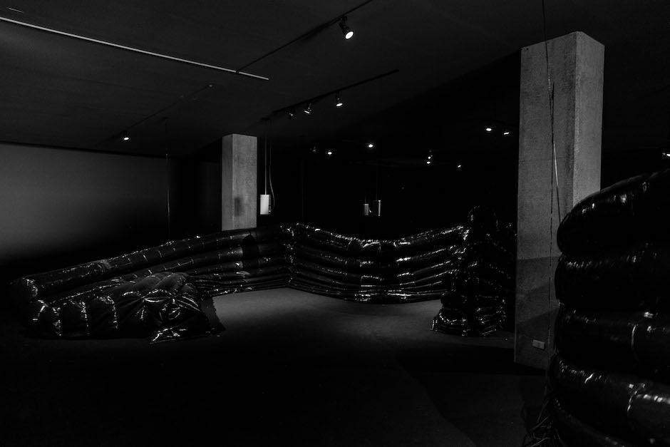 賈桂琳.きよみ.寇克處理建築空間裡的聲音特質,並以物件為載體,來提升聽覺上的敏感度及感知。當裝置組件中的鼓風機開姶將環繞在展場的乙烯基軟性塑料充飽時,會發出一種特別的共振頻率,藝術家將這頻率透過揚聲器系統播放而出。在漆黑的展間裡,風扇充氟的聲音搭配黑色裝置的起伏膨脹,有如一個非人的管弦樂團,引領觀眾進大一個聲響和空間格局交錯複雜的沉浸式感官體驗。
