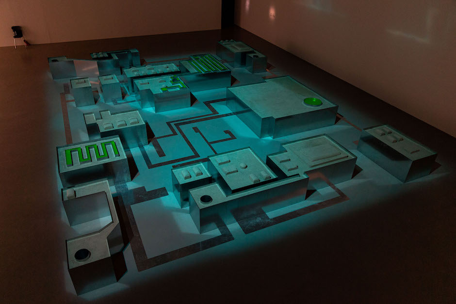 香港藝術家唐納天以晶片和電路板為靈感,委託創作出大型「沙盒」裝置作品,混淆我們對尺度的感受,重新認識界限與擴縮性等議題。此件作品也與知名哲學家保羅.維希留(Paul Virilio,1932-2018)一系列1960年代法國沿岸遺留下來的納粹碉堡影像的攝影作品並置展示,藉由「碉堡考古學」反思科技與戰爭對現代意識之影響。