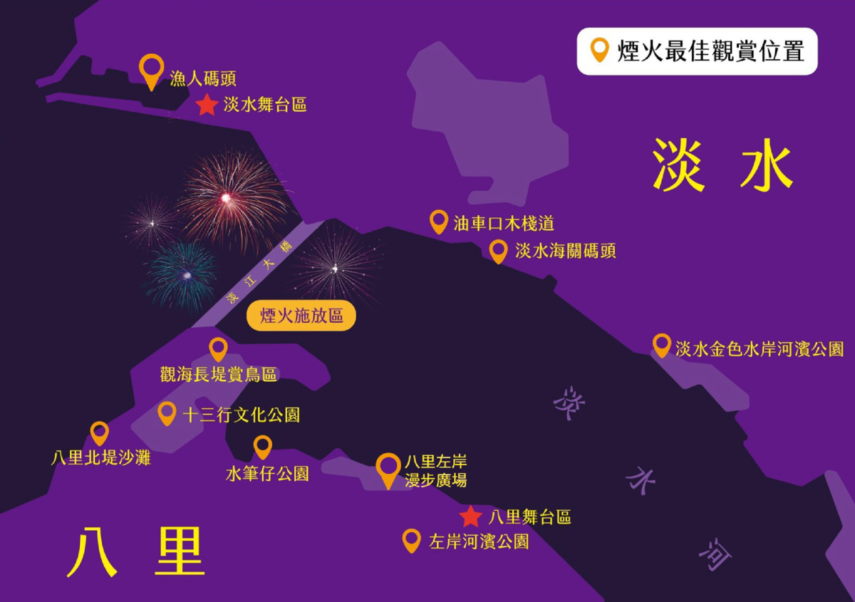 跨河煙火將綻放於淡水漁人碼頭夜空,若想捕捉完整的璀璨煙火秀,在「淡水端」建議可以至淡水金色海岸河濱公園、海關碼頭、油車口木棧道、漁人碼頭觀賞;「八里端」則可至八里左岸河濱公園、水筆仔公園、觀海長堤賞鳥區、十三行文化公園、北提海灘、八里左岸漫步廣場。編輯也貼心提醒大家,因天氣多變化,千萬要注意保暖喔~