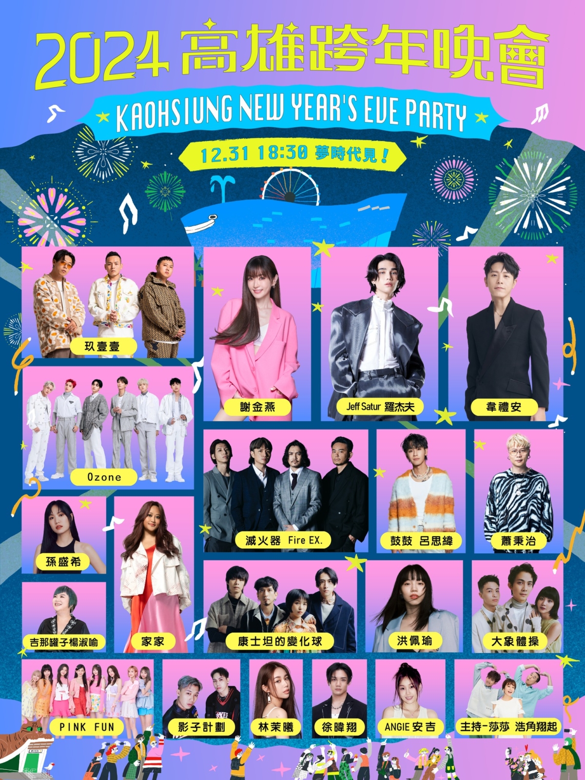 南台灣也是星光熠熠,跨年晚會太精彩!卡司包含謝金燕、Jeff Satur羅杰夫、蕭秉治、玖壹壹、韋禮安、鼓鼓、家家、孫盛希、Ozone等,全部共多達20組藝人將登台亮相。而壓軸的「亞灣跨年花火」,更帶來240秒的超大規模,準備與大家一起嗨翻夢時代!