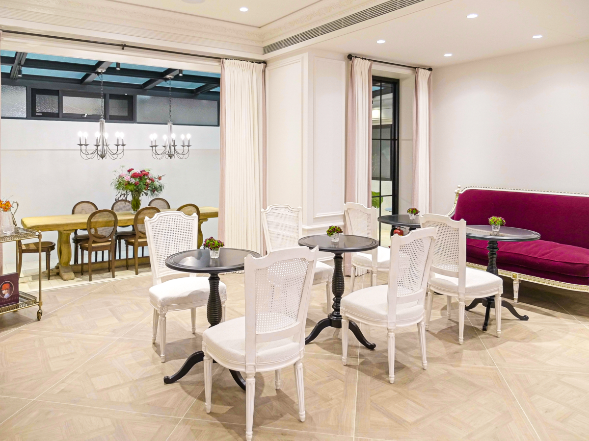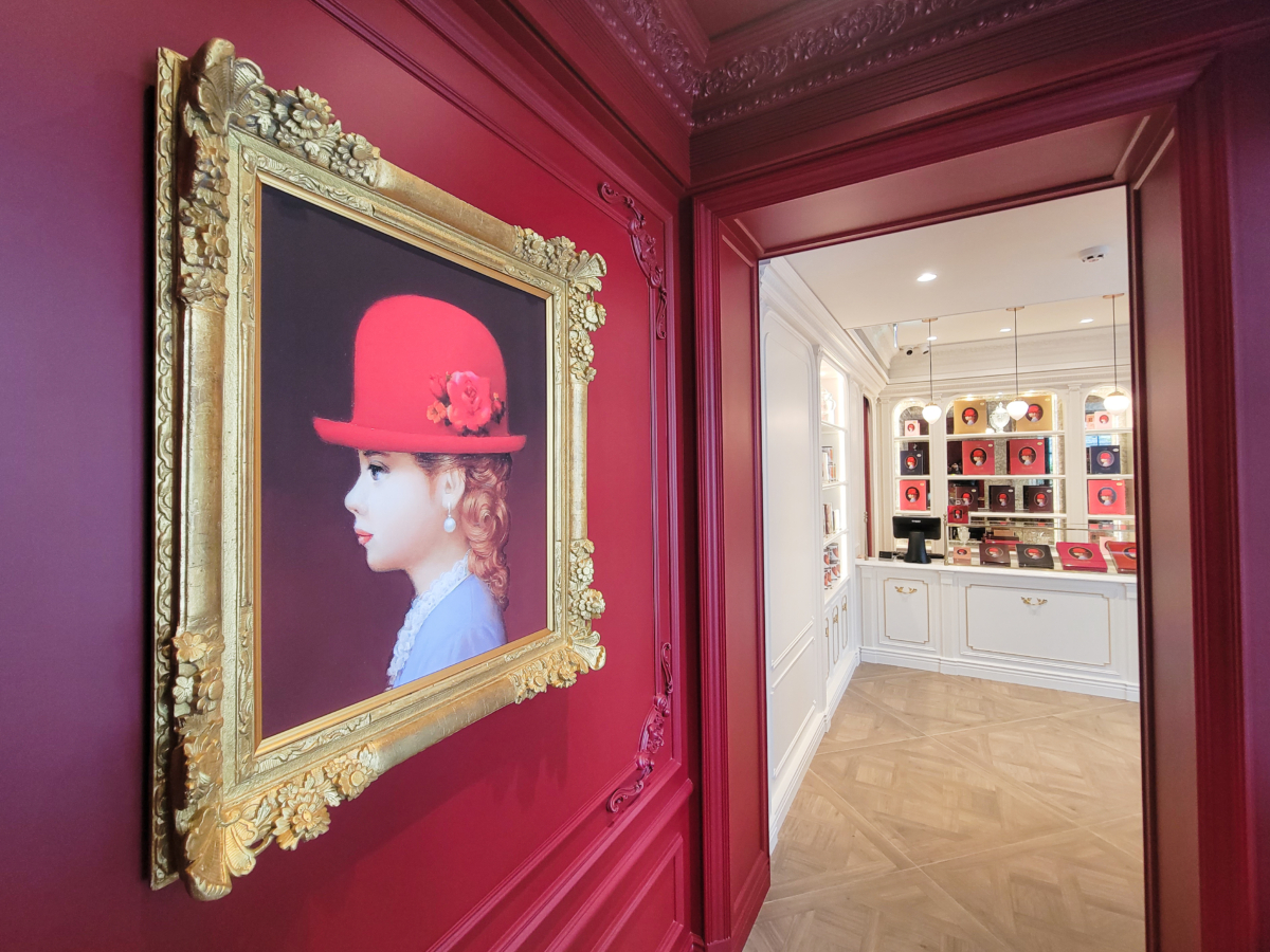 紅帽子全新品牌概念店打造成一座白色系為主的西式洋房,並與招牌紅色相配,整體的歐風設計美到不行!從入口的玄關處便能見到,牆上懸掛著大幅的紅帽子少女油畫,店內歐式家具均為海外進口,其中沙發區的金色鏡子為法國帶來,還保有復古使用痕跡。