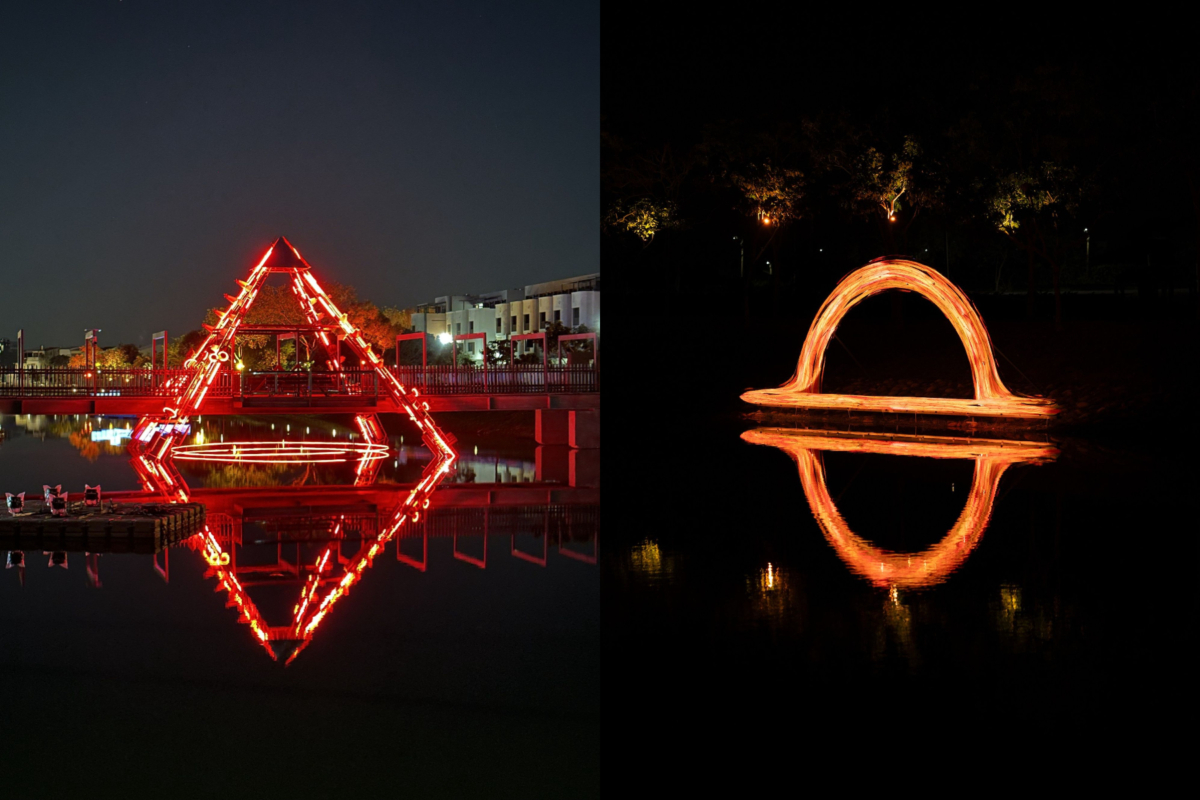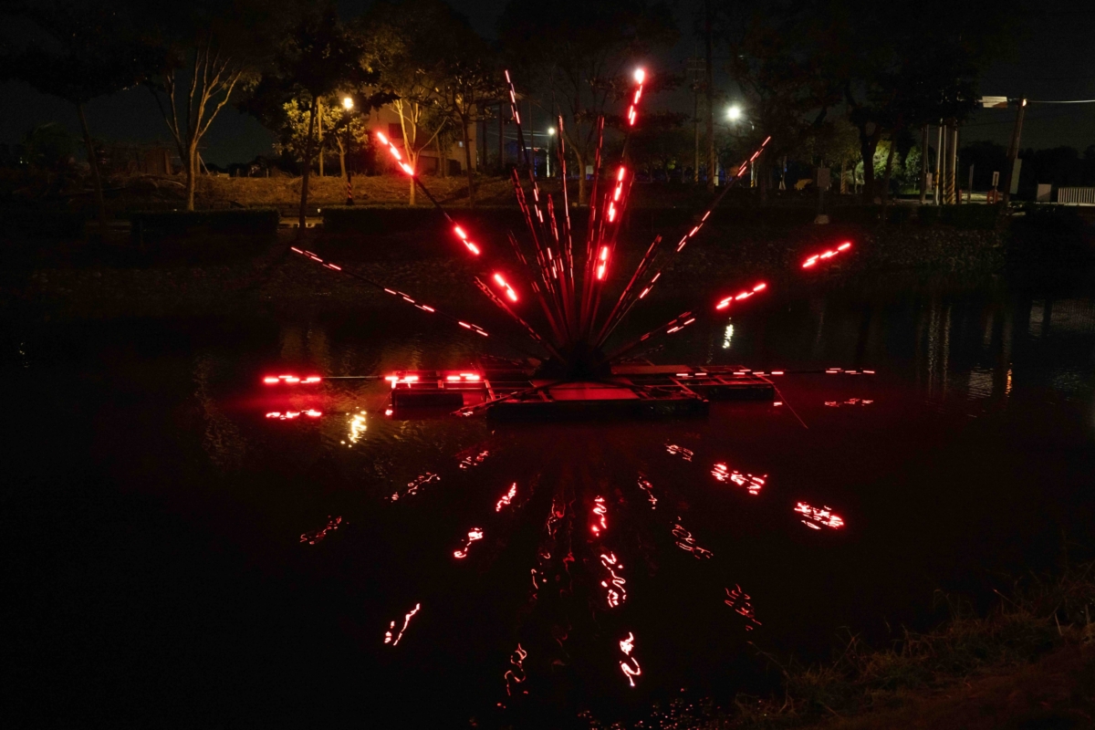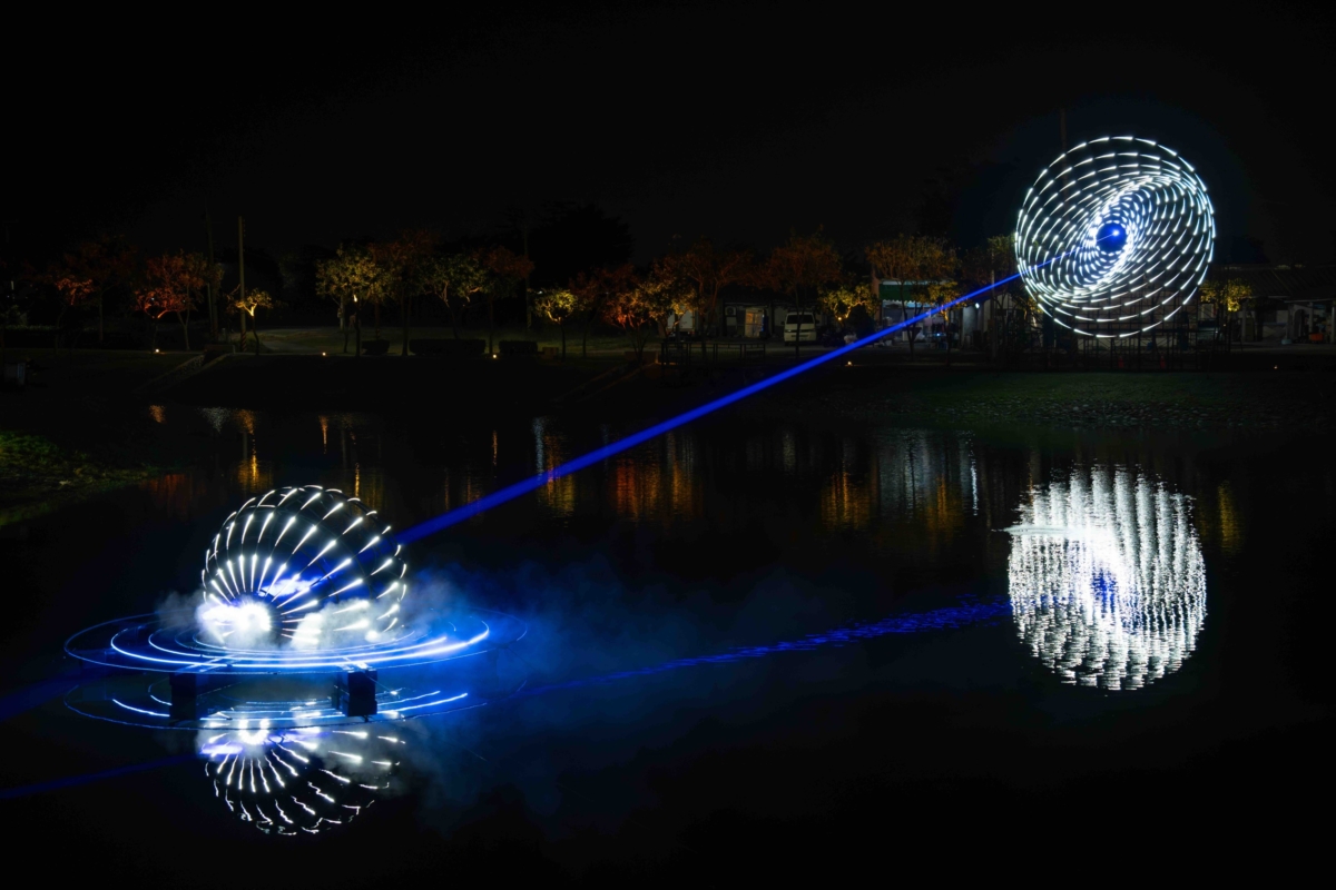 2025燈節主燈作品《無盡光輪》由「UxU Design」操刀,層層光圈宛如穿越時空的隧道,水幕投影《光的年輪》則由黑川互動媒體藝術團隊設計,將時間的流動具象化;以及日本藝術家森岡厚次《又一個月圓》等結合在地蜂炮意象及科幻感的空間作品。