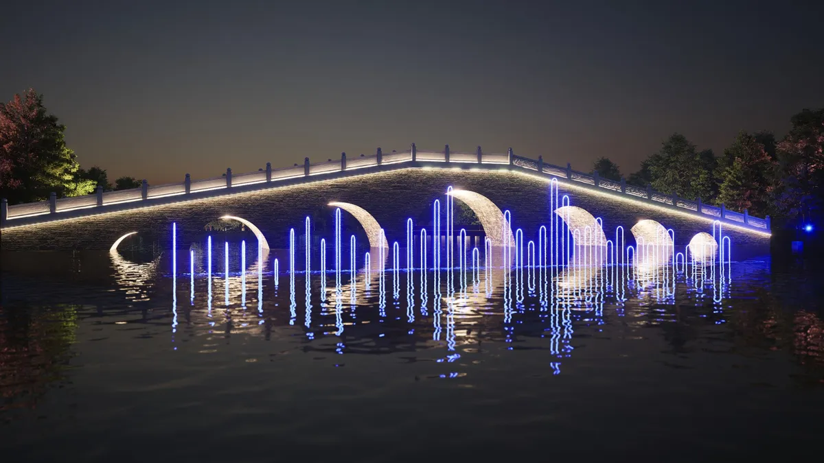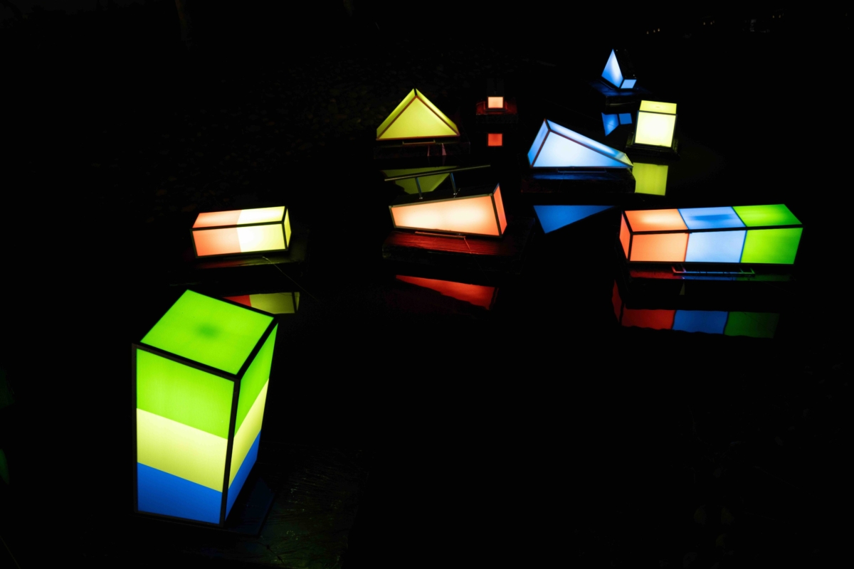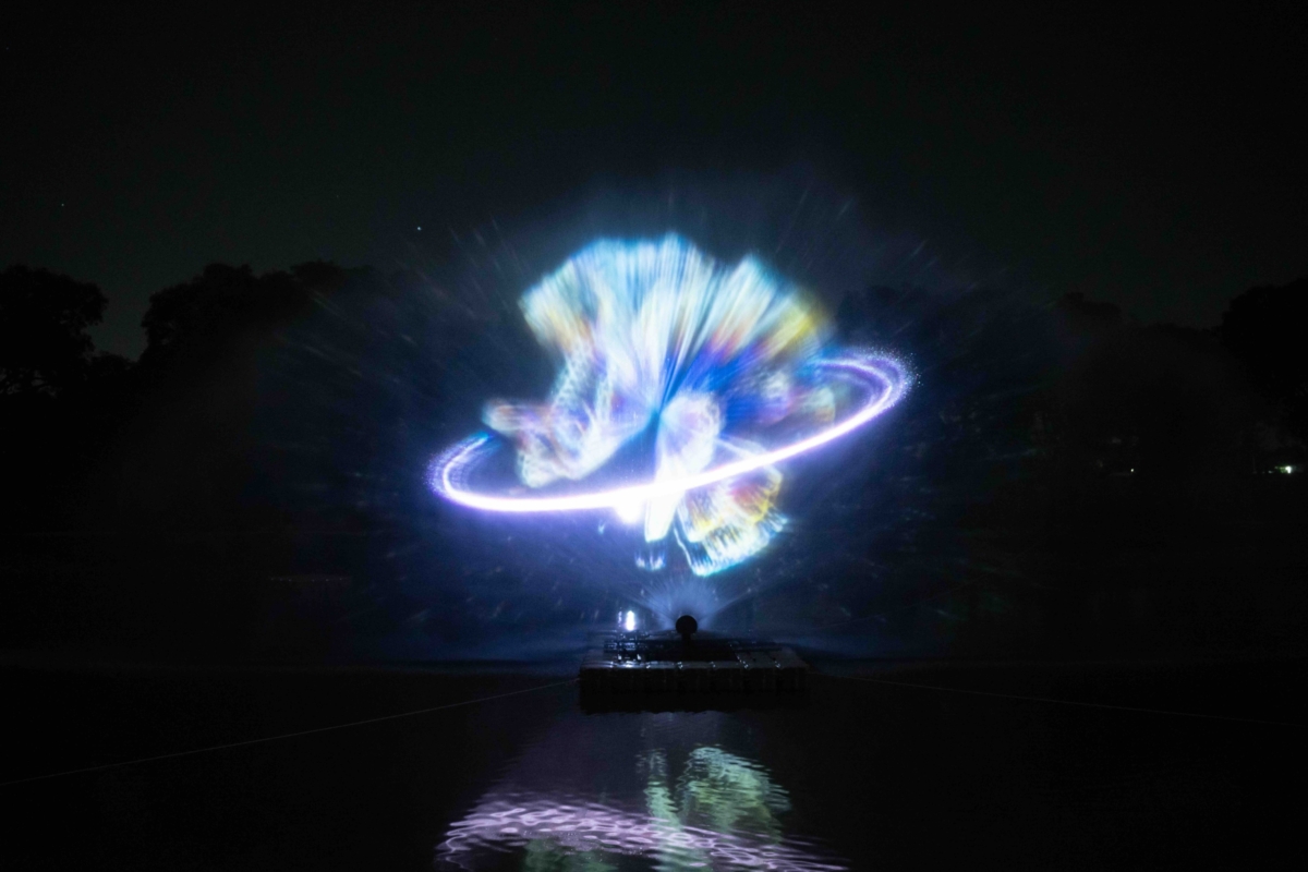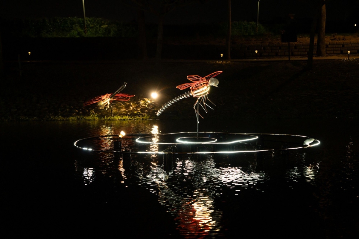 2025燈節主燈作品《無盡光輪》由「UxU Design」操刀,層層光圈宛如穿越時空的隧道,水幕投影《光的年輪》則由黑川互動媒體藝術團隊設計,將時間的流動具象化;以及日本藝術家森岡厚次《又一個月圓》等結合在地蜂炮意象及科幻感的空間作品。