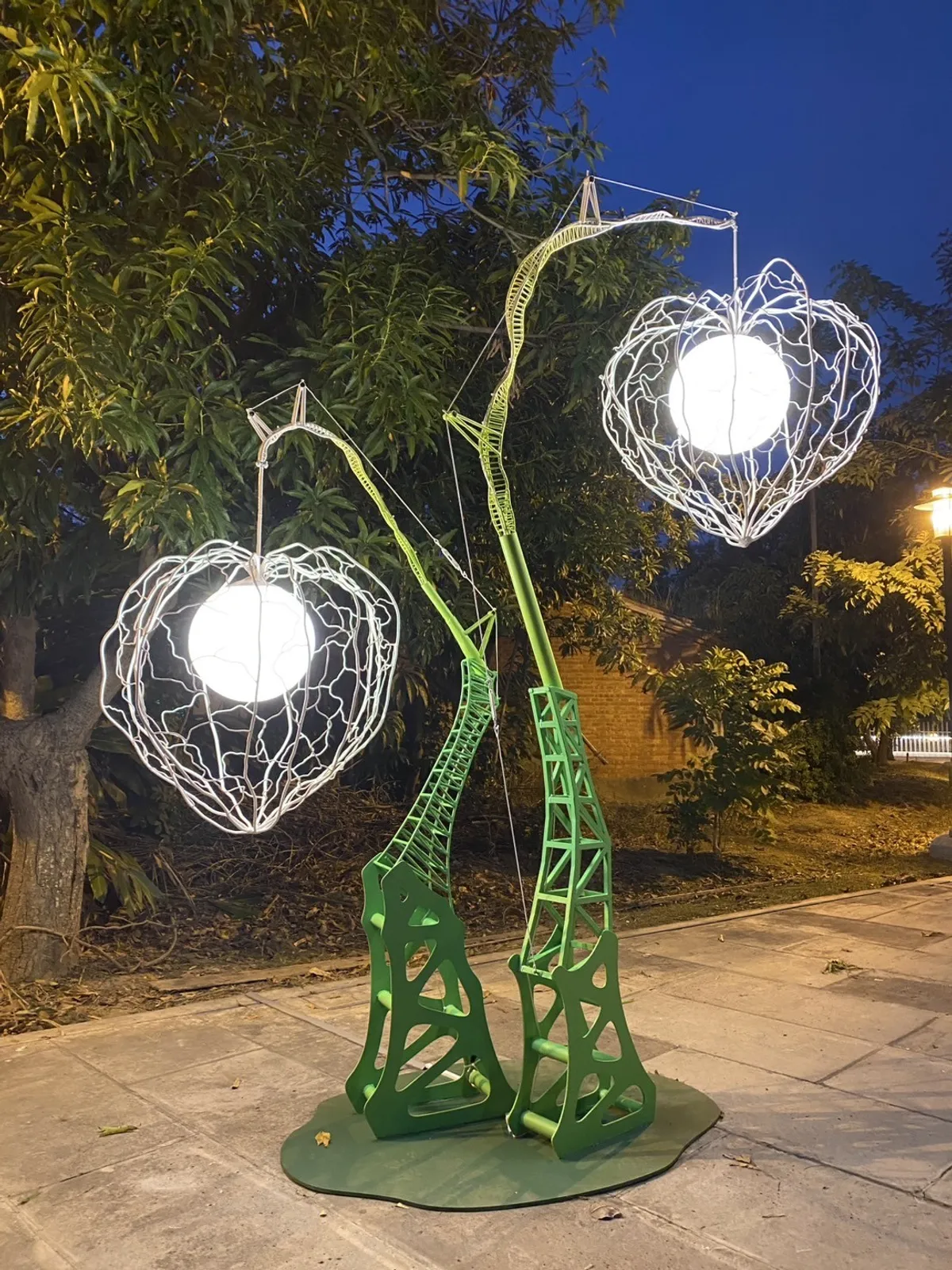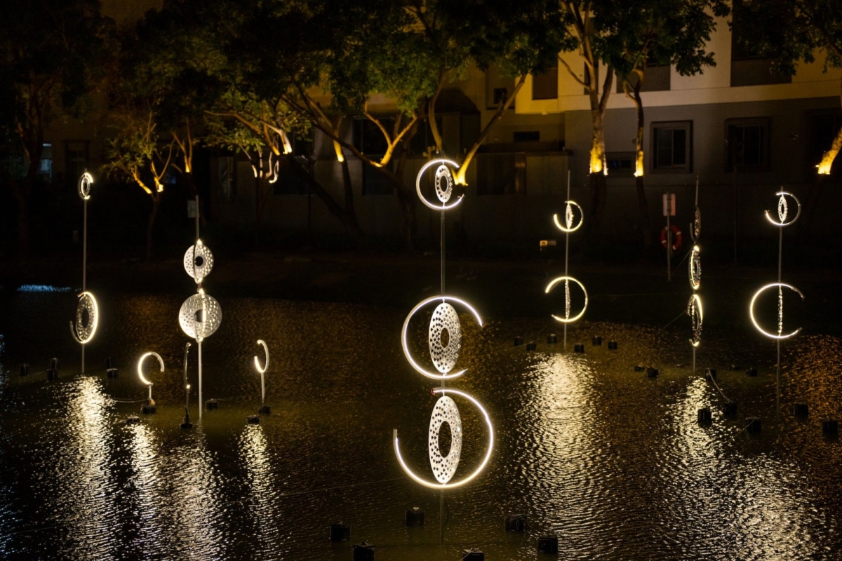 月津港燈節全新展區納入公19口袋公園,依現地自然環境設置4組植物意象《榮光幻花》作品,以臺灣常見的姑婆芋、蕉葉、蒲公英、野花造型,利用金屬轉譯呈現植物堅韌的生命力,透過薄板營造輕盈、流動、韻律的視覺效果,作品融合街道家具功能,帶來公園新樣貌。