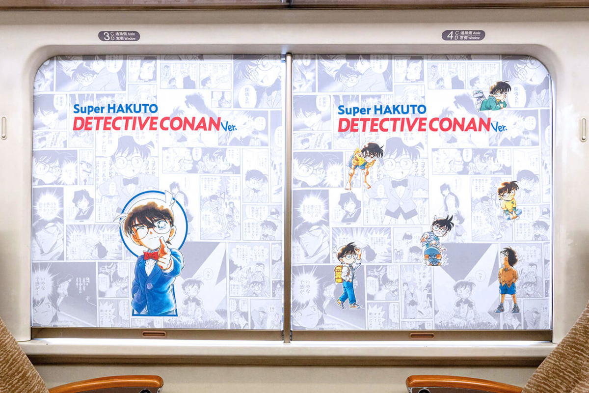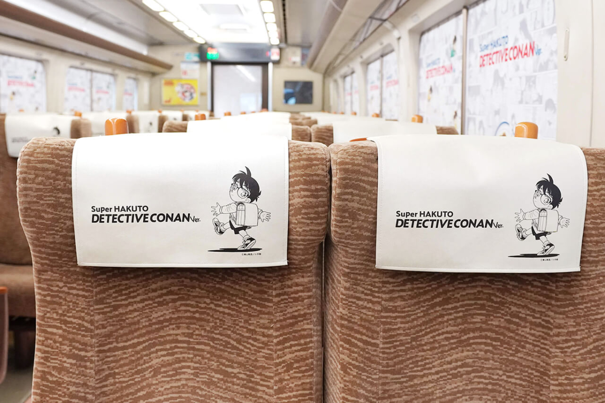 而這回特別推出的「超級白兔名偵探柯南列車(スーパーはくと名探偵コナン号)」,將往返關西與鳥取的「JR特急超級白兔號」其中一節車廂,換上《名偵探柯南》的彩繪塗裝設計,包含車廂地板、座枕靠墊、窗簾等等,由裡到外全都是打卡點!