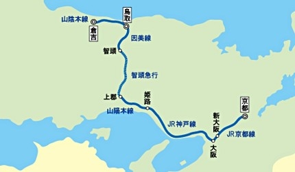 停靠車站:京都站 - 新大阪站 - 大阪站 - 三之宮站 - (神戶車站) - 明石站 - (西明石車站) - (加古川車站) - 姬路站 - 上郡站 - 佐用站、大原站、智頭站 - 郡家站 - 鳥取站 - 倉吉站 *括號為僅部分車次停靠
