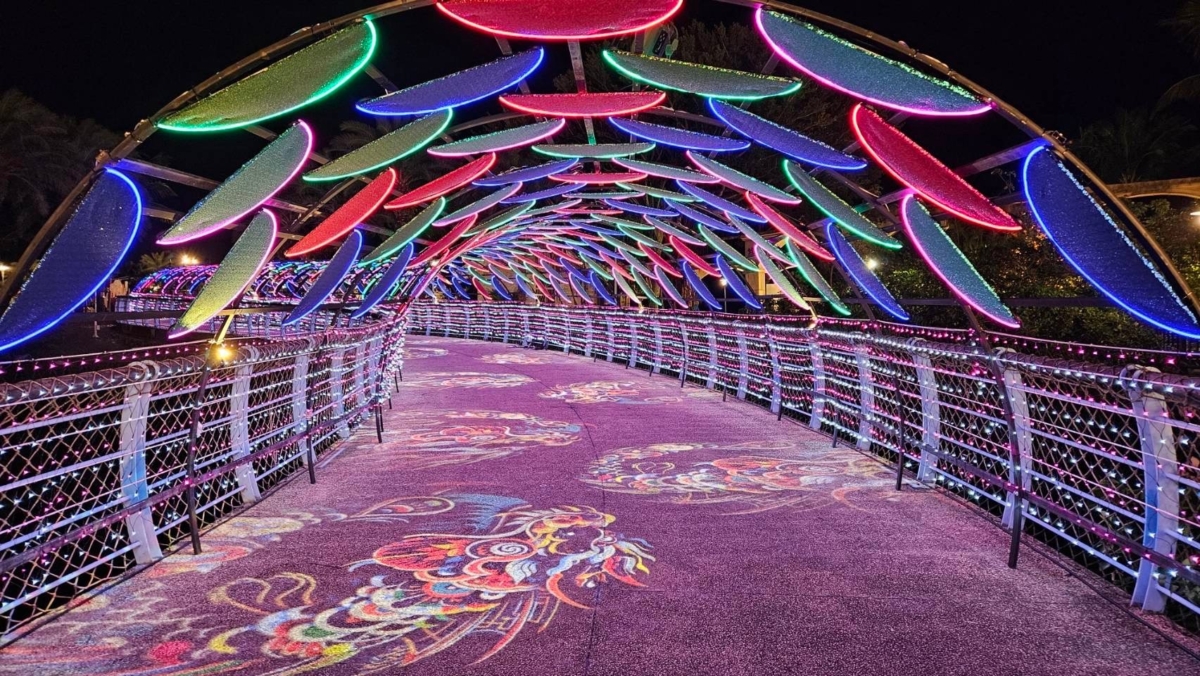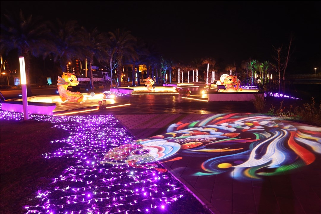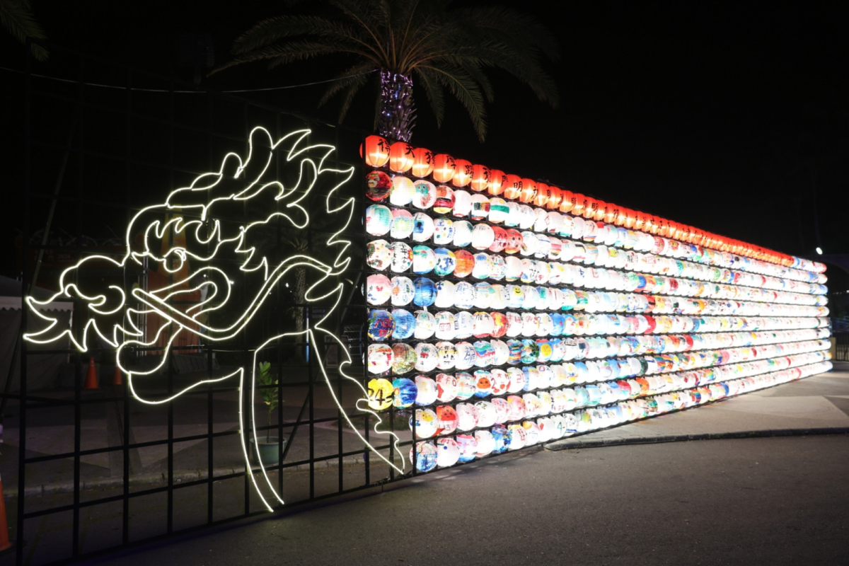 找來龍年出生為主的學童彩繪出1500顆燈籠,打造出「萬燈呈瑞」的龍身意象,並以燈光勾勒出龍頭及龍尾。每盞燈籠上都是孩子們天馬行空的創作,仔細看可能會發現有趣小驚喜,並且承載著孩子們的夢想與希望。
