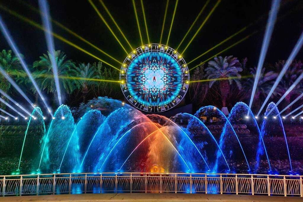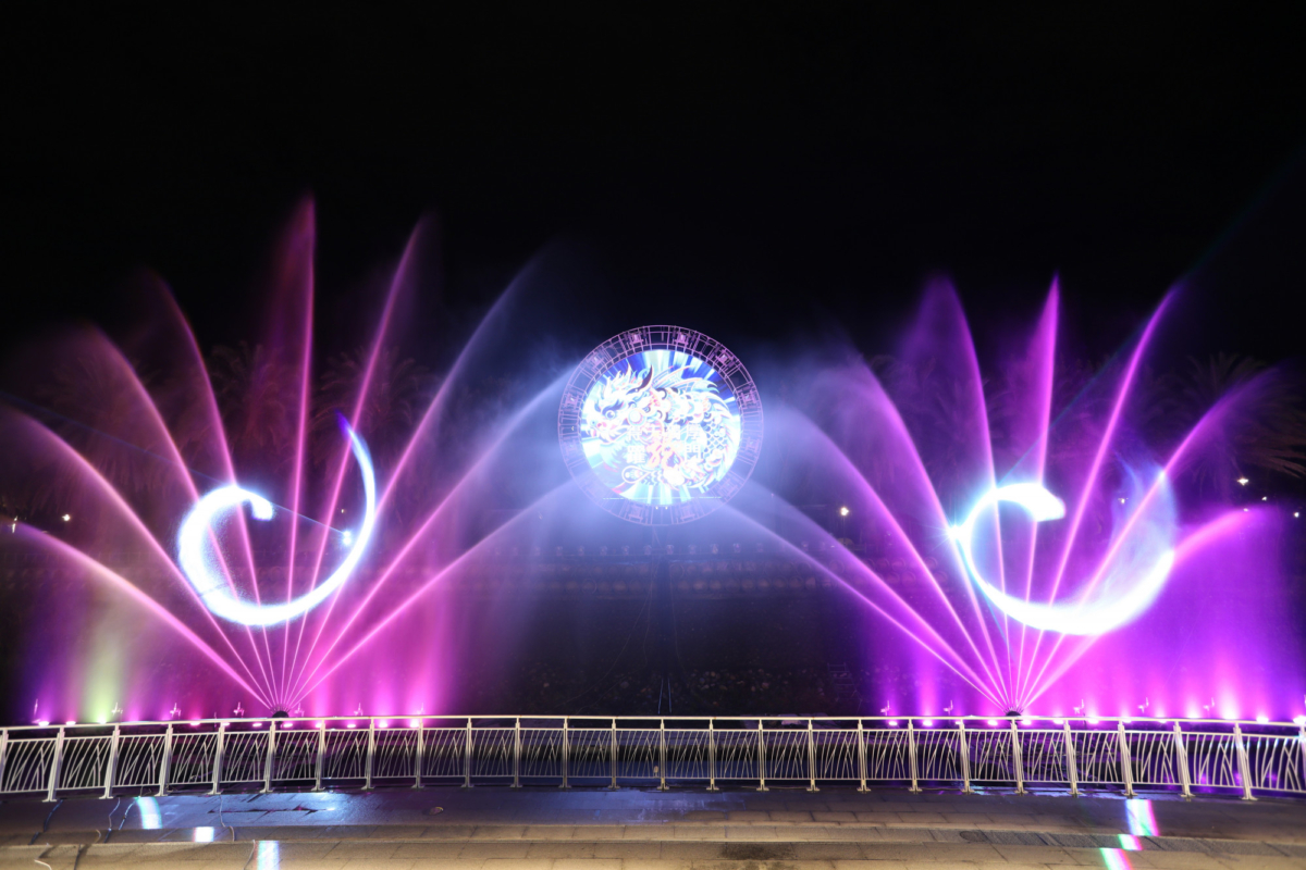 首先不能錯過的,便是以高達15米的環型立體科技打造的水舞聲光秀!由林昆穎老師領導的團隊操刀,引用故宮典藏的「鏤空月裁雲金龍運巧智奪天晶片心」象牙球工藝,透過3D動畫結合水幕雷射動畫展現出「雙龍戲珠」的特效畫面。