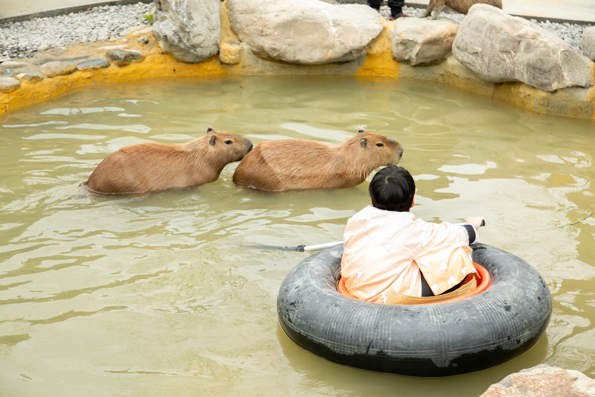 雖然水豚在台灣已經不足為奇,但在園內的「水豚森林浴」互動區,遊客們可以換上現場提供的日式浴衣,與水豚們一起享受溫泉按摩泡腳,小朋友甚至可以划船與水豚共遊!是不是光想像畫面就超級可愛呢?