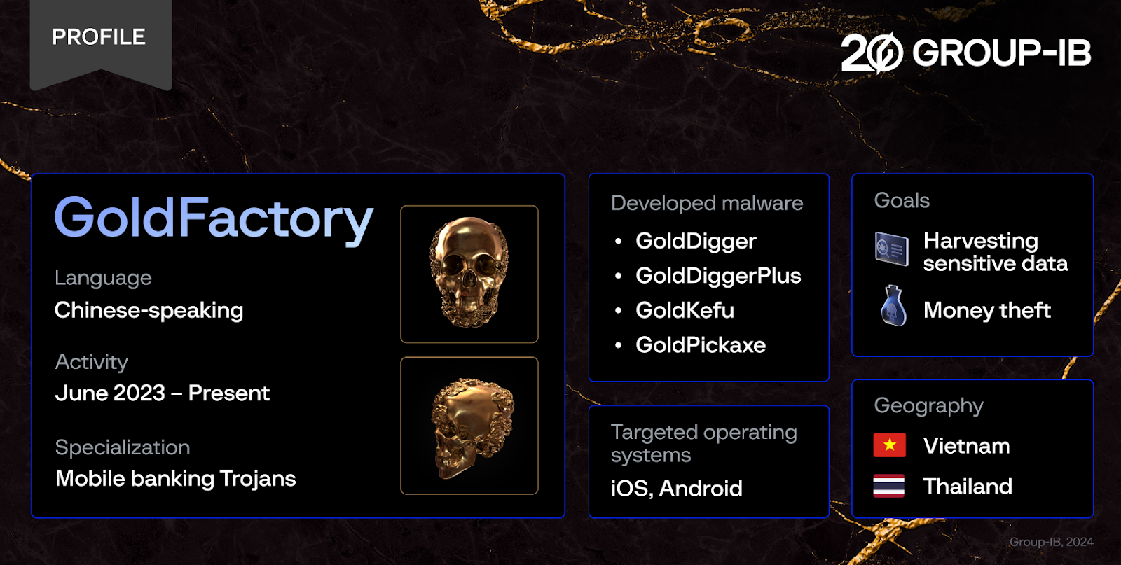 而Group-IB認為,散布GoldDigger的是一個名為「GoldFactory」的犯罪組織,其攻擊對象主要針對亞太地區,特別是泰國和越南。不過目前證據顯示,GoldFactory的攻擊範圍已開始擴展到越南、泰國之外。且組織的攻擊技術可能在全球範圍皆有效。