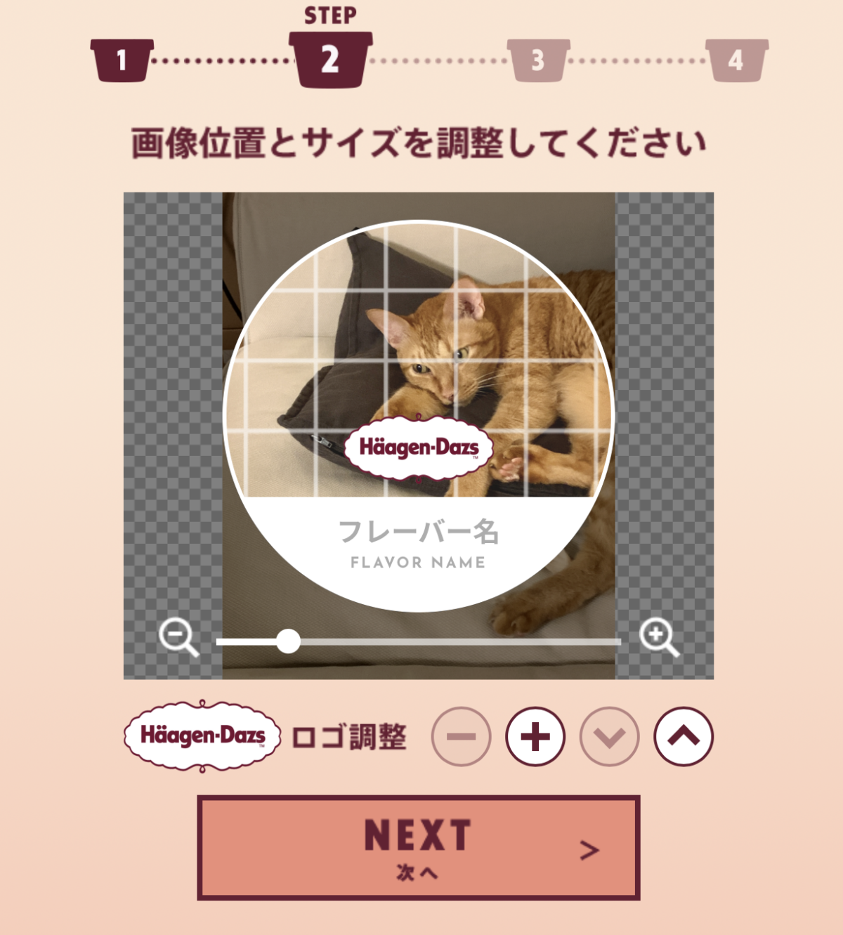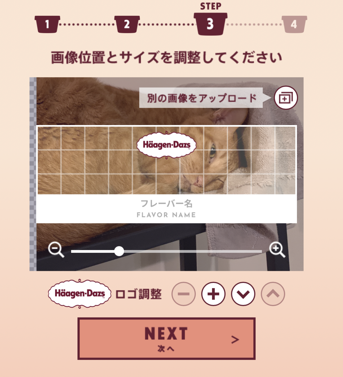 首先要製作杯蓋封面照,挑選一張貓咪照片上傳,接著再來調整照片大小(放大鏡),要是哈根達斯LOGO遮到照片也能點擊-、+、上下,根據自己偏好的樣式進行調整~
