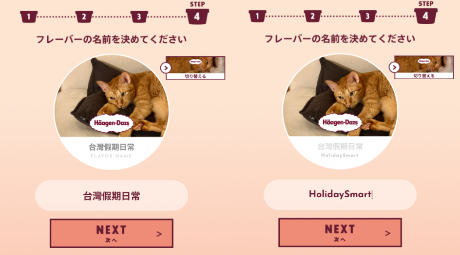 將杯蓋及杯身製作完成後,就可以為冰淇淋命名!上排一共可以輸入10個文字,經過編輯實測中文、英文都能輸入;而下排則開放輸入15字以內的英文、數字,輸入完畢後按下NEXT就完成啦~