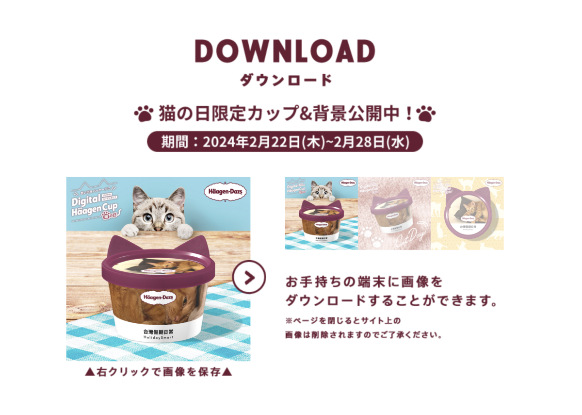 貓奴們快看!2月22日正好是日本「猫の日」(ねこのひ),人氣冰淇淋品牌「哈根達斯」這回推出「Digital Häagen Cup」活動,只要在官網上傳照片,就能客製化專屬冰淇淋包裝,不僅圓蓋上方多了小貓耳,甚至還有一系列背景,快來跟著步驟幫主子變身冰淇淋封面吧!