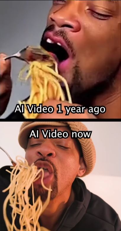 一年前備受討論的「威爾史密斯吃義大利麵」影片是透過「Modelscope」AI模組所生成,當時因AI技術尚未成熟,人物行為只能以一種弔詭、扭曲的方式呈現,甚至連臉部表情都無法正常生成,沒想到成品卻進而在網路上病毒式傳播,成為爆紅迷因。