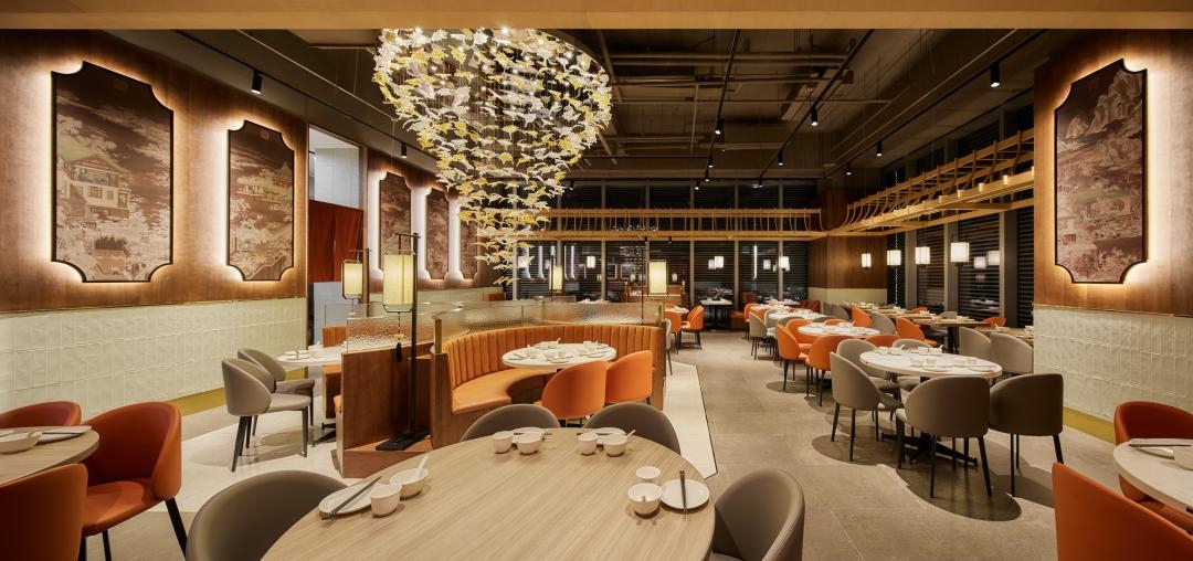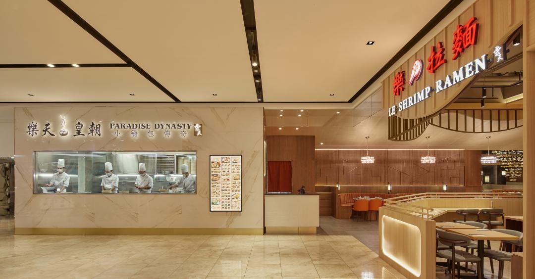 全新雙店面由台中知名設計公司「號外制作所」操刀,「樂天皇朝」氛圍以小籠包源起的宋朝為靈感,整合橘紅及溫潤的木色,搭配立體的巨型落葉吊燈,將東方復古情調與現代融合;「樂蝦拉麵」則利用明亮燈光、白木色系與手繪風壁畫打造年輕風格,營造溫暖且新穎的品牌形象。