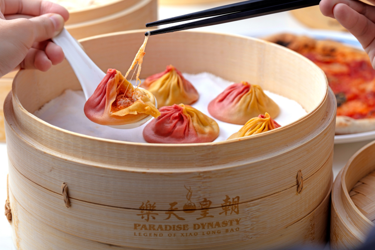 「樂天皇朝」以招牌八色小籠包最為著名,幾乎每桌客人都會來上一份~而為慶祝新店開幕,聯名「樂蝦拉麵」以瑪格麗特比薩為靈感,推出創意新品「PIZZA小籠包」,牽絲內餡超級誘人!不過期間限定、只送不賣,想要嚐鮮的朋友可於3/3前點招牌皇朝小籠包,即能免費贈送一籠。