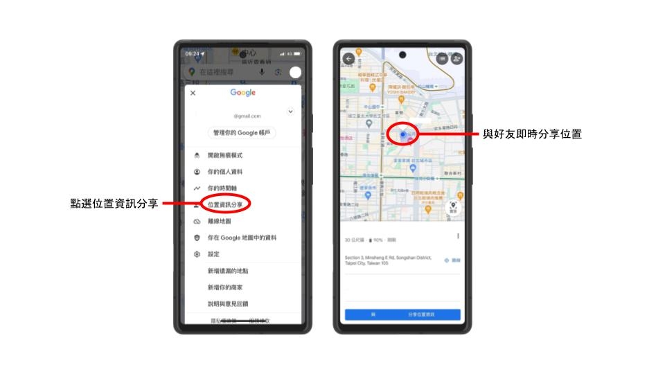 如果想在假期體驗山林之美,可以運用Google地圖搜尋地點,就能一覽必去景點標記和入口指示,同時也能下載「離線地圖」,即使無法上網也能離線查看。此外,記得「分享位置資訊」給親朋好友,查看你的預設行程,讓彼此更安心。