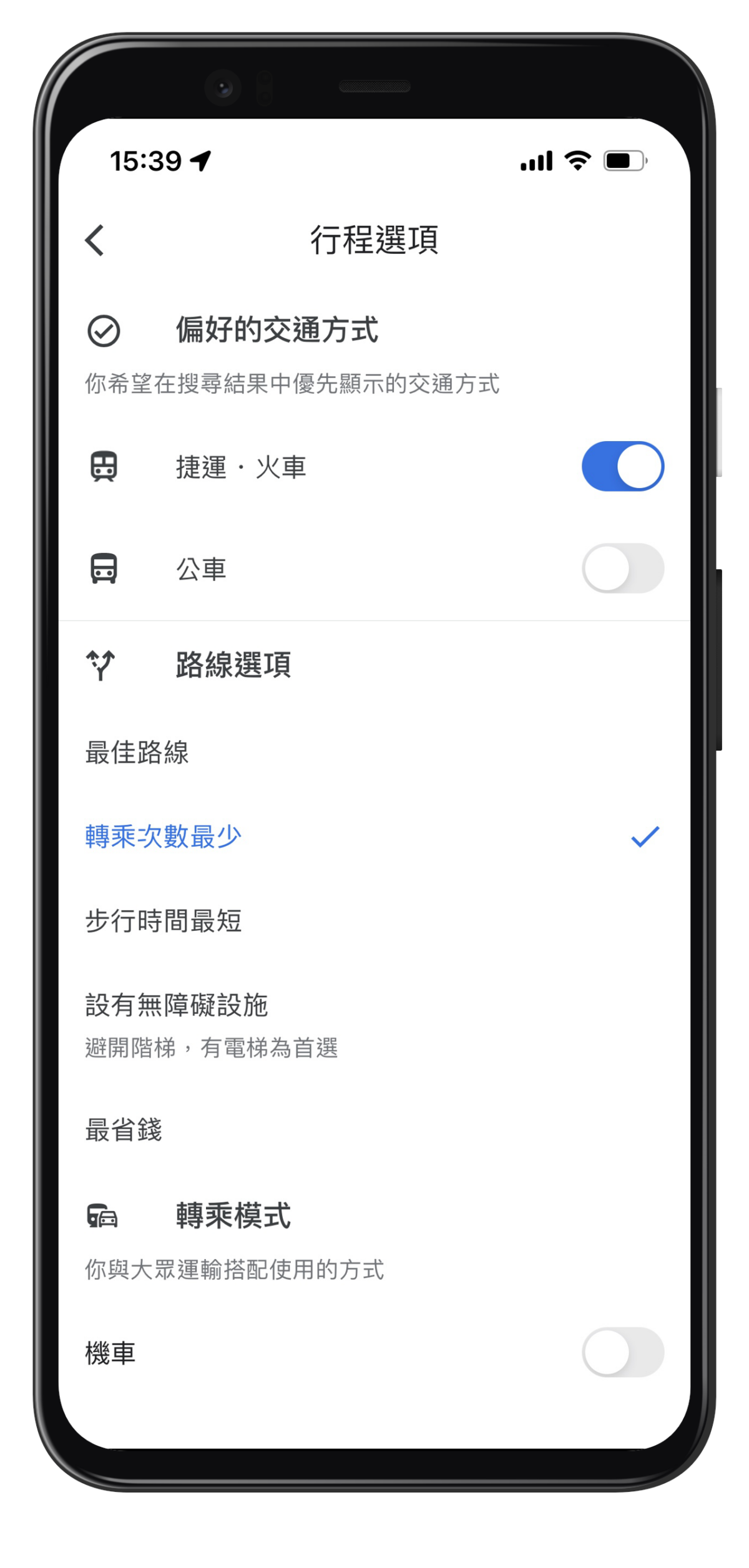 要是想搭乘火車體驗沿途風景,免去一路轉乘的麻煩;或是希望能在搭乘大眾運輸工具以及步行時,選擇一條輪椅友善的路線,可以在「調整路線並顯示路徑」設定中,選取「有無障礙設施」、「轉乘次數最少」等選項,打造個人化最佳路徑。