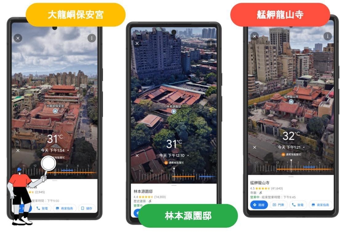 Google地圖上已經有多處可使用「沉浸式實景功能」,除了體驗身歷其境、用不同角度欣賞各大國家城市景點外,也能拉動時間滑桿、查看地點不同時間的天氣和擁擠程度來規劃行程。