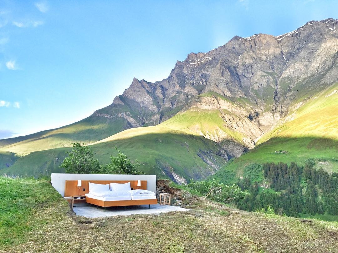 走遍世界各地,看過各種千奇百怪的旅館,但你聽過沒有屋頂和牆壁,只有一張床的「0星級旅館」嗎?來自瑞士的「Null Stern Hotel」提供這樣純粹的住宿體驗,在這裡放眼望去只有阿爾卑斯山美景、在山坡上散步的牛群,顛覆你對傳統旅館的想像!