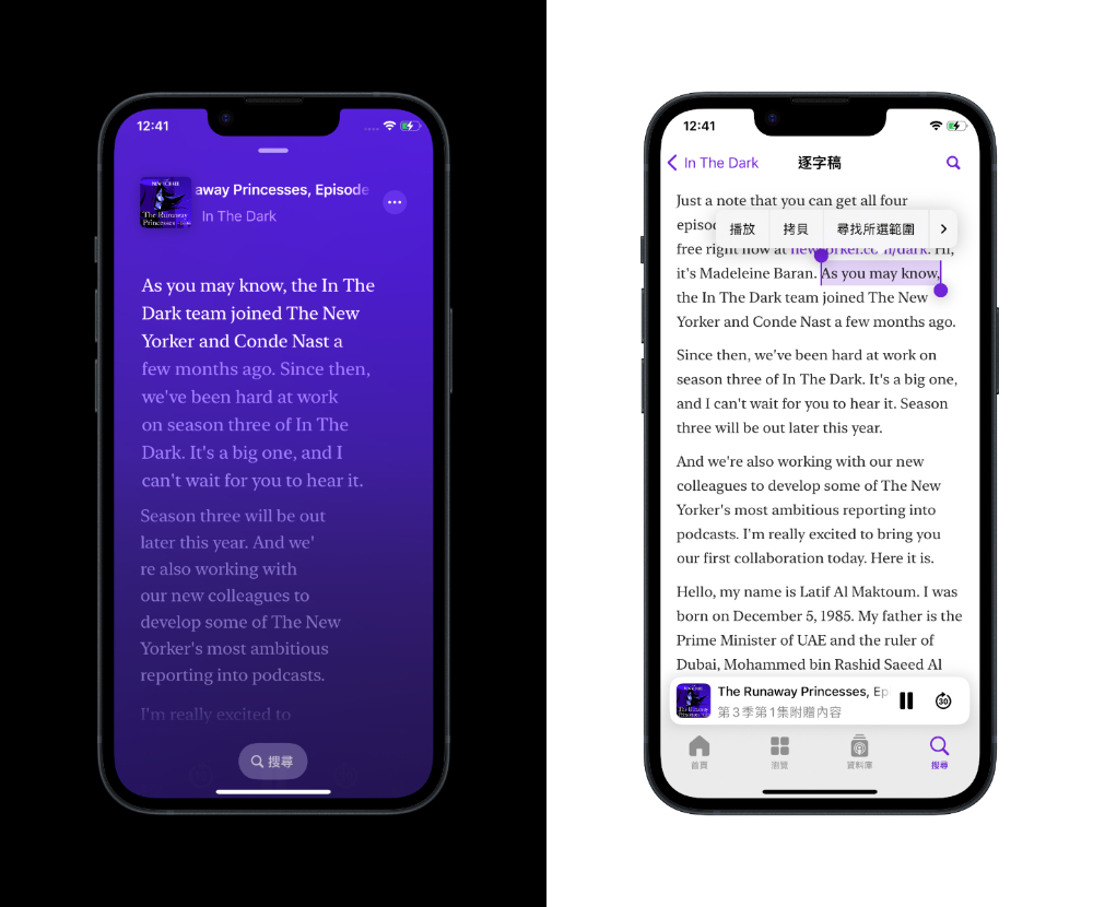 iOS 17.4還有一項實用的新功能,Podcast不再侷限於音訊內容,只要在收聽英文節目時,點擊左下角的「逐字稿」按鈕,系統就會將語音內容轉譯文字,讓用戶能以此查看節目內容、搜尋關鍵字以及快轉播放,大幅強化Podcast的使用體驗。