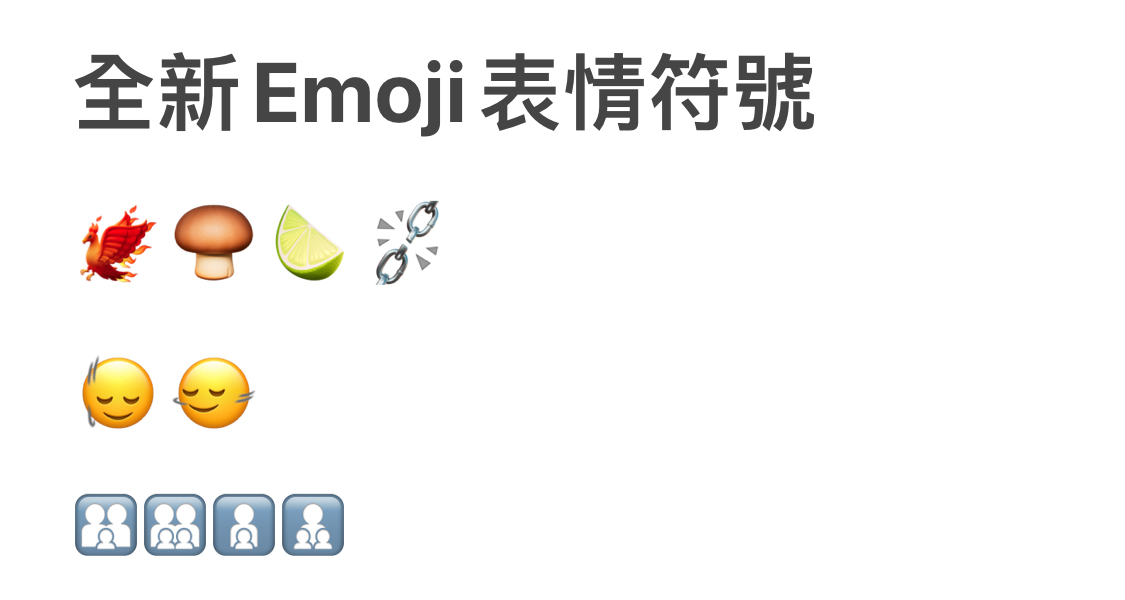 在iOS 17.4更新中,加入多個全新的Emoji表情符號,其中比較特別的有蘑菇、鳳凰、萊姆、斷鏈、點頭和搖頭,以及18個家庭成員性別圖示,以後聊天的Emoji選擇又更加豐富了!