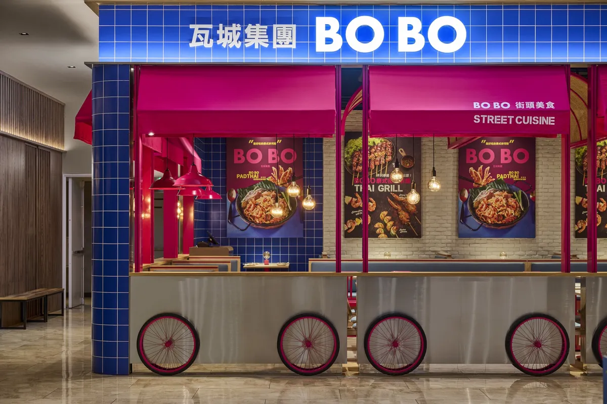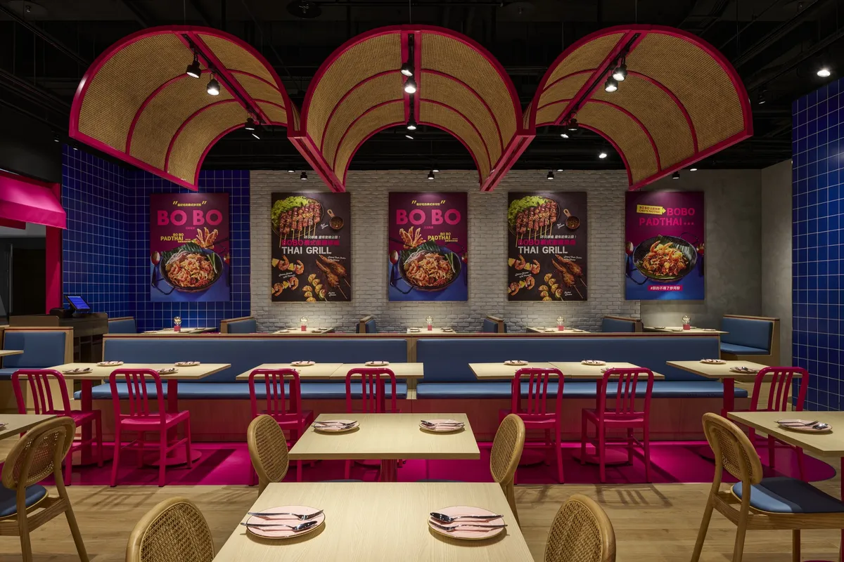 「BO BO」的首店坐落於新莊宏匯廣場六樓,裝潢以亮眼的粉色和藍色交織設計,從餐車造型外觀,到桌椅、餐具以及桌燈,搭配開放式廚房,讓人一走進餐廳,彷彿置身泰國曼谷般的奔放熱情!