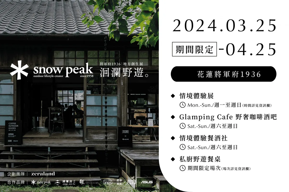 園區首次開幕與Snow Peak合作,集結國際品牌和在地廠商,提供奢華野奢精品咖啡、星空帳篷下的米其林歐陸料理等活動,並大量運用Snow Peak的露營設備和戶外用品,打造期間限定的沉浸式情境體驗展「洄瀾野遊」,自3/25至4/25期間展出。